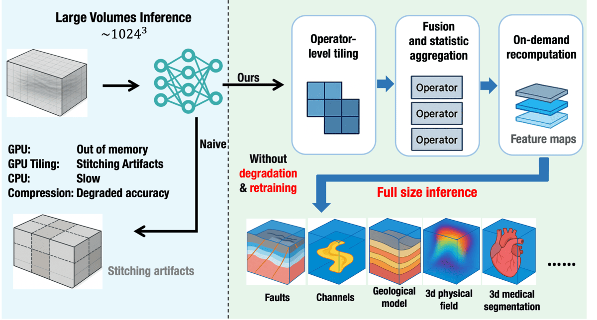 Large-volume 3D dense prediction is essential in industrial applications such as energy exploration and medical image segmentation. However, existing deep learning models struggle to process full-size volumetric inputs at inference due to memory constraints and inefficient operator execution. Conventional solutions—such as tiling or compression—often introduce artifacts, compromise spatial consistency, or require retraining. We present a retraining-free inference optimization framework that enables accurate, efficient, whole-volume prediction without any performance degradation. Our approach integrates operator spatial tiling, operator fusion, normalization statistic aggregation, and on-demand feature recomputation to reduce memory usage and accelerate runtime. Validated across multiple seismic exploration models, our framework supports full size inference on volumes exceeding \(1024^3\) voxels. On FaultSeg3D, for instance, it completes inference on a \(1024^3\) volume in 7.5 seconds using just 27.6 GB of memory—compared to conventional inference, which can handle only \(448^3\) inputs under the same budget, marking a \(13\times\) increase in volume size without loss in performance. Unlike traditional patch-wise inference, our method preserves global structural coherence, making it particularly suited for tasks inherently incompatible with chunked processing, such as implicit geological structure estimation. This work offers a generalizable, engineering-friendly solution for deploying 3D models at scale across industrial domains.
